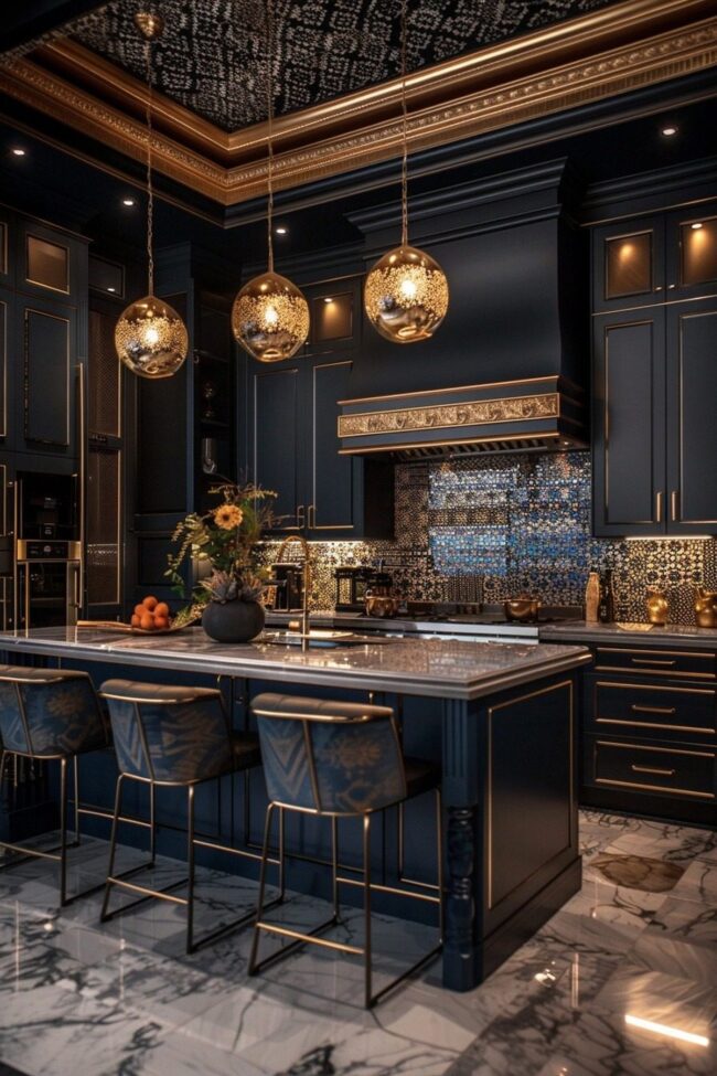 Rich navy cabinets create a dramatic backdrop in this kitchen, inviting you to indulge in culinary adventures.