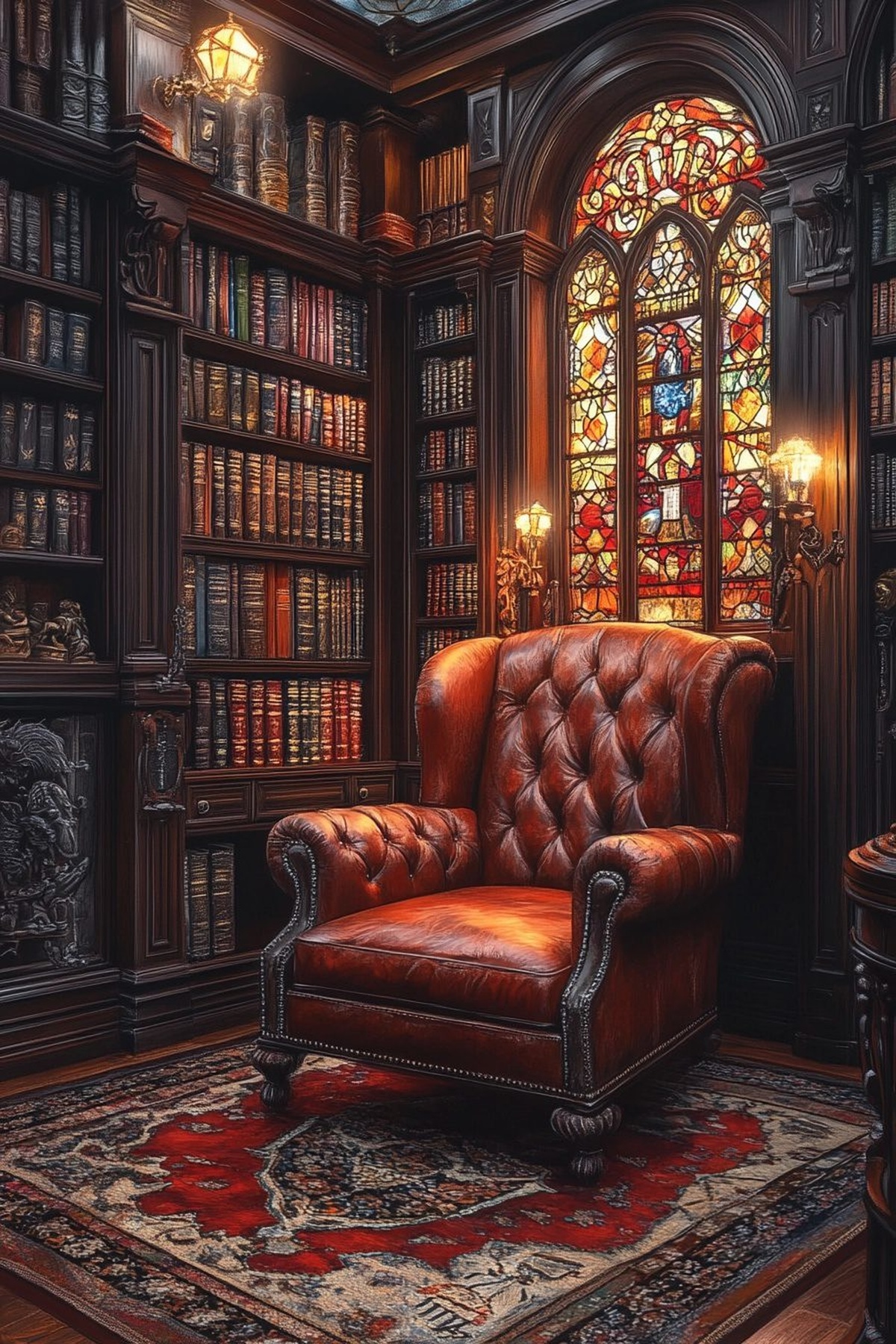 Rich textures and deep colors create an atmosphere reminiscent of a medieval study, making this style ideal for libraries or home offices.