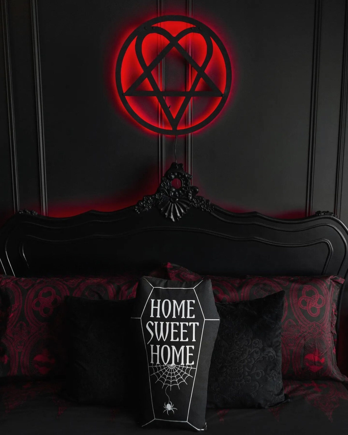 Wall hangings, sculptures, and even practical items like lamps often display icons such as angels, crosses, or mysterious sigils.