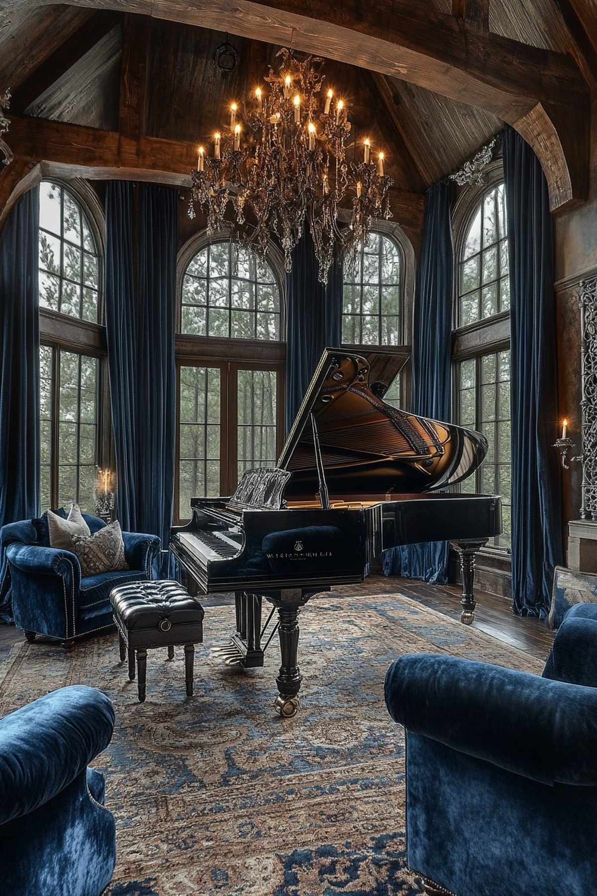 Heavy drapes and plush furniture add comfort while Gothic touches such as pointed arches or stained glass provide character.