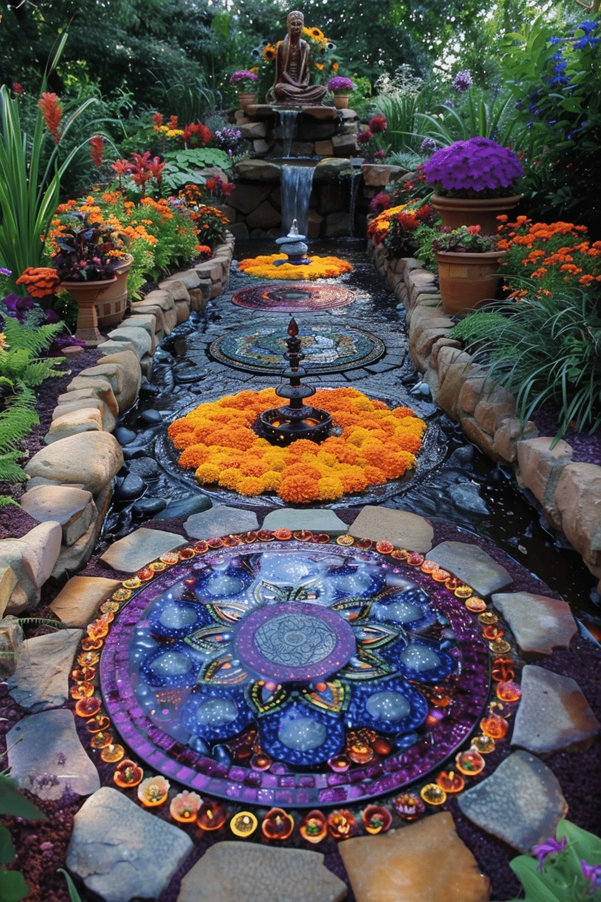 The gentle sound of flowing water adds a calming rhythm as vibrant blooms burst with life around every corner.