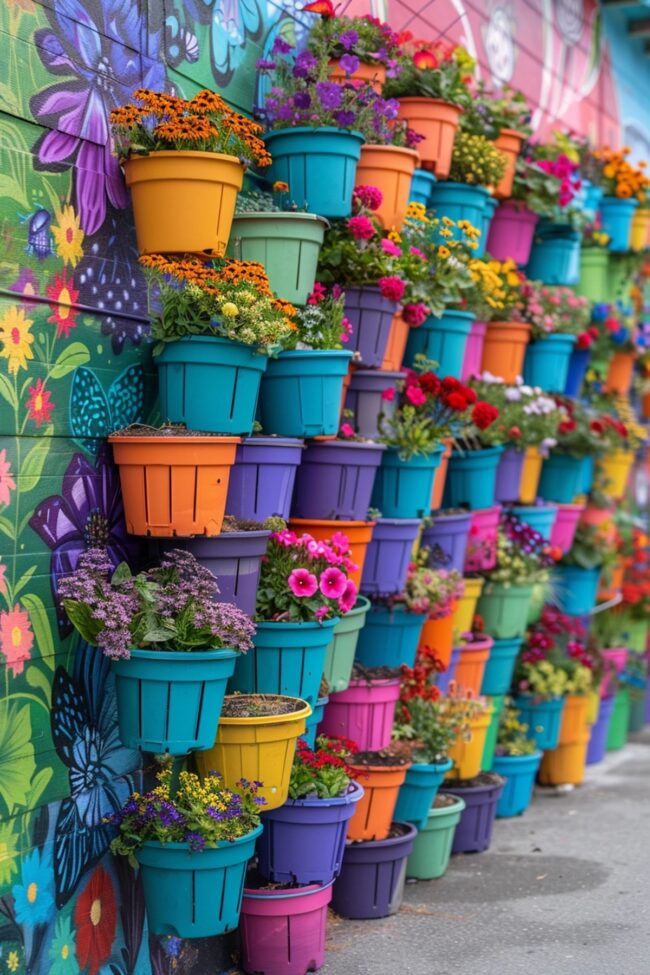 Colorful flower pots create a lively display against a vibrant mural.