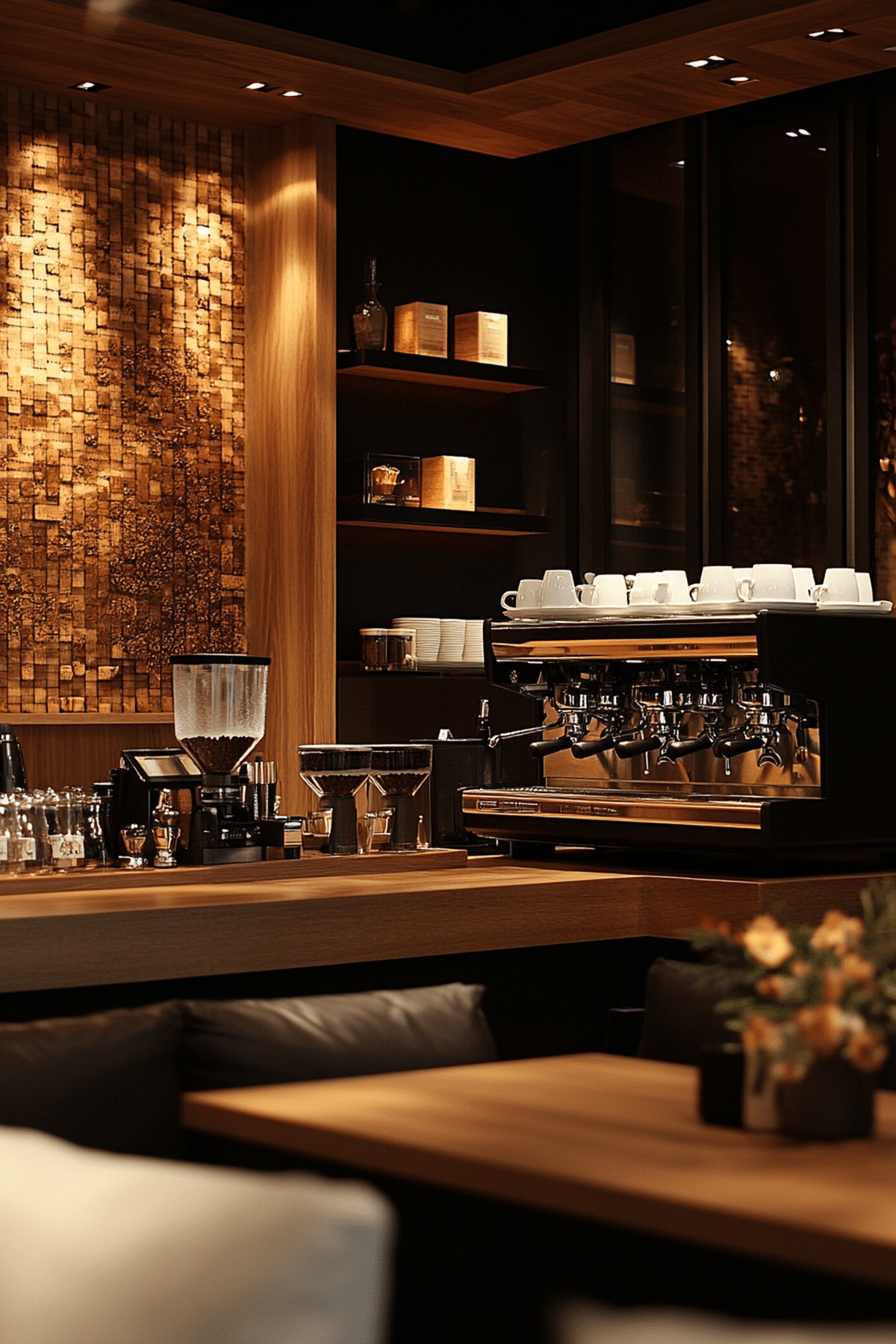 The area features a top-of-the-line espresso machine, comfortable seating, and elegant decor to enhance the coffee-tasting experience.