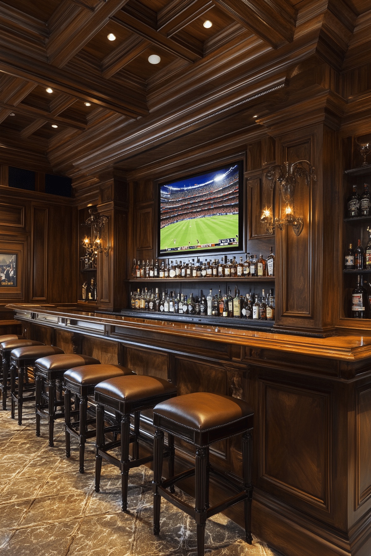 The sophisticated sports lounge combines elegant bar design, multiple screens, and rich decor to create a space that’s perfect for watching the big game.