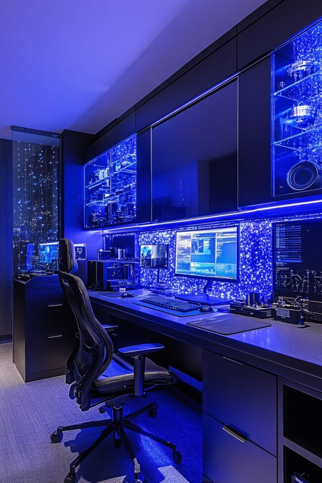 A cutting-edge gaming haven is designed with the latest technology, featuring ergonomic furniture, multiple screens, and vibrant LED lighting to enhance your gaming sessions.