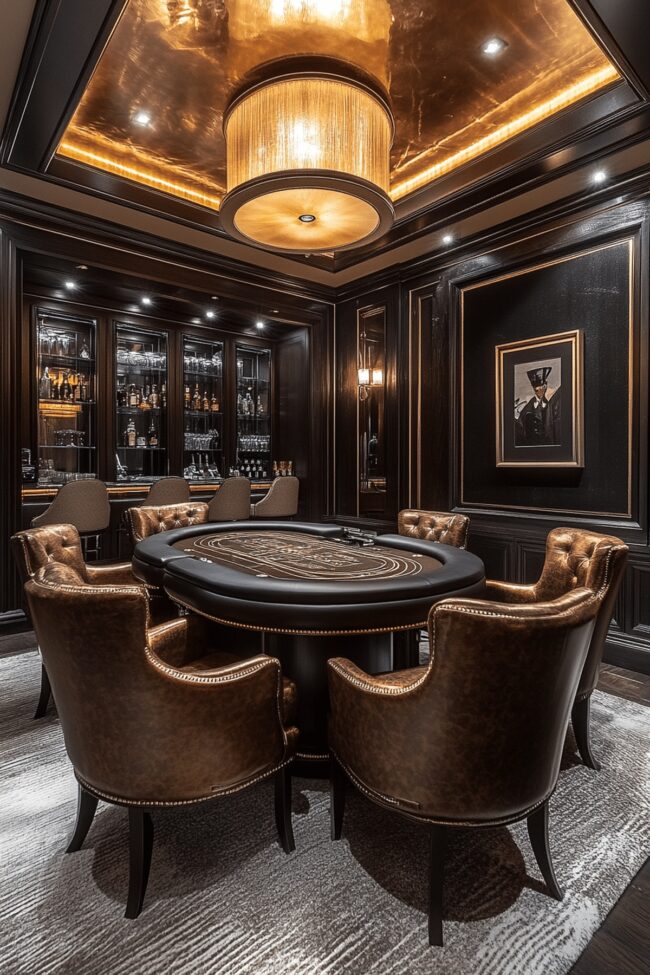 The central poker table is complemented by luxurious seating and mood lighting that sets the perfect atmosphere for high-stakes games.